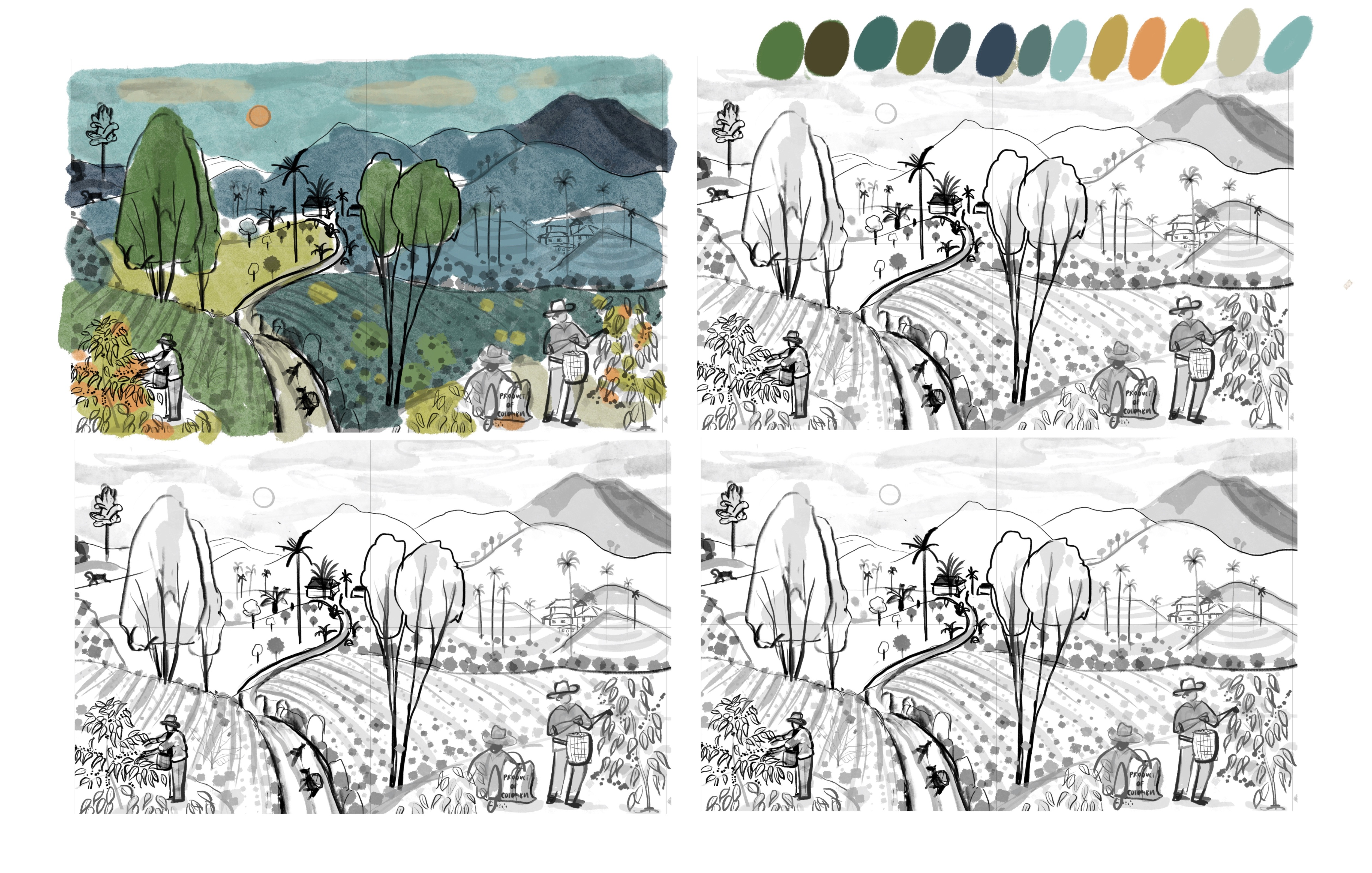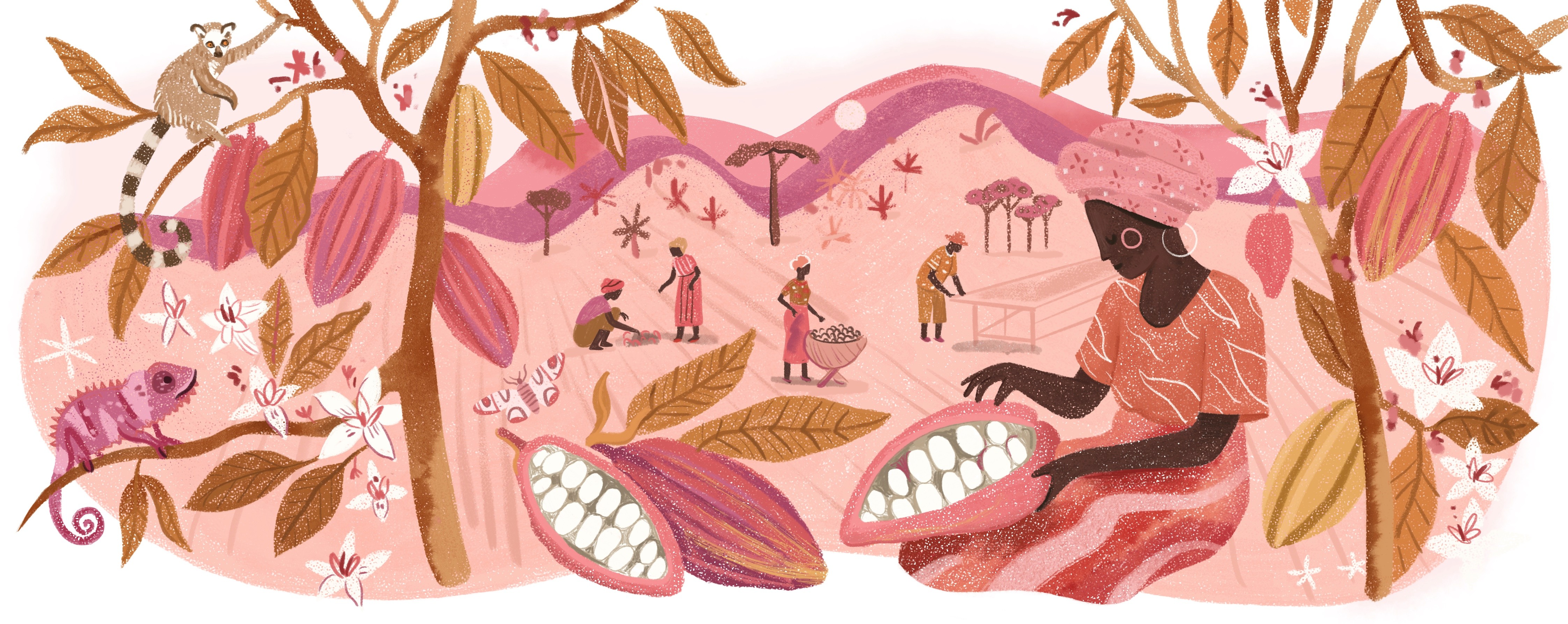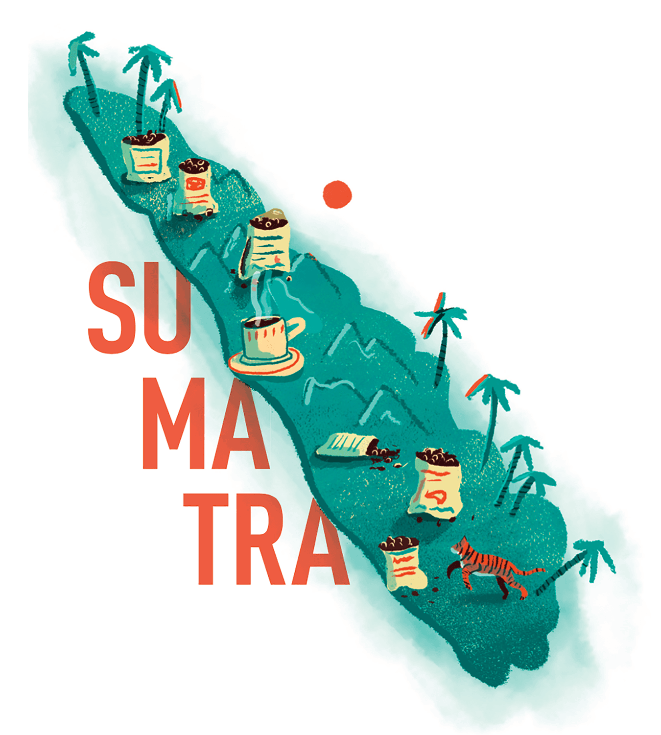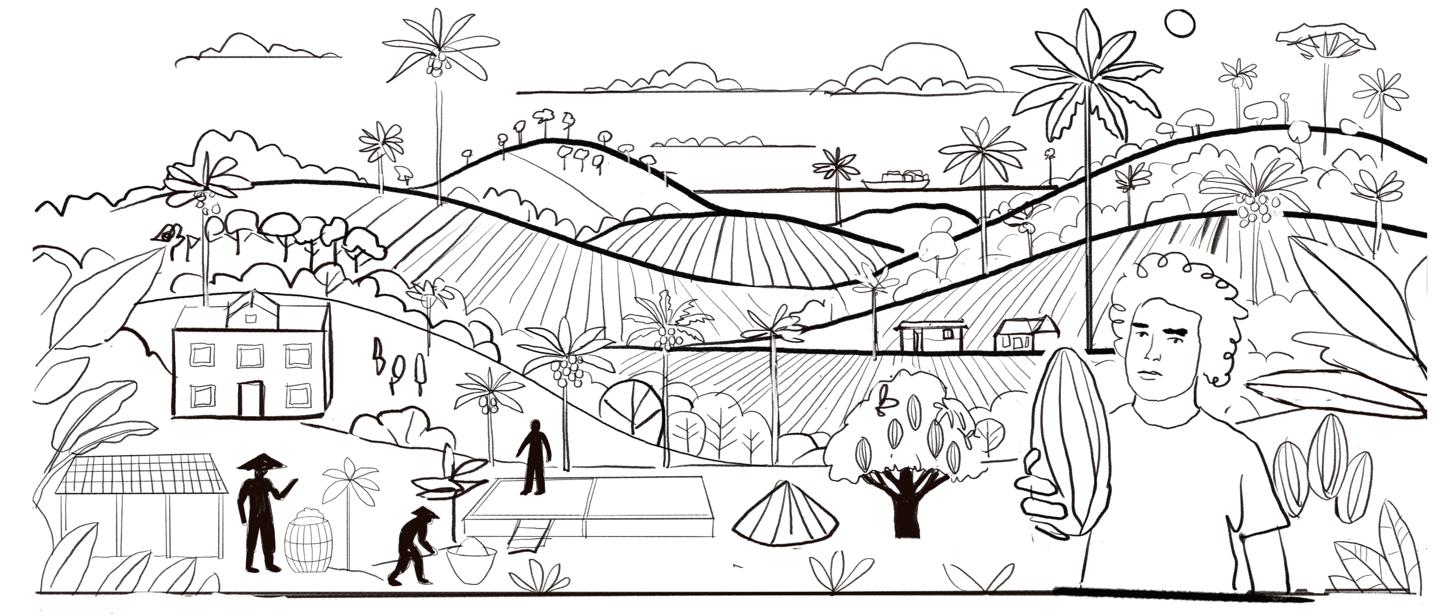 Create a recurring illustration series that brings distant coffee, tea and cacao regions closer to the reader.